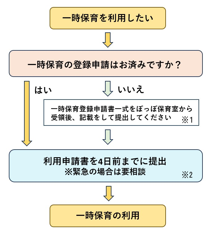 事前に一時保育登録申請書等、必要書類を提出して登録を行い、事前打ち合わせを済ませ予約・調整後利用可能に案ります。(緊急の場合はご相談ください。)